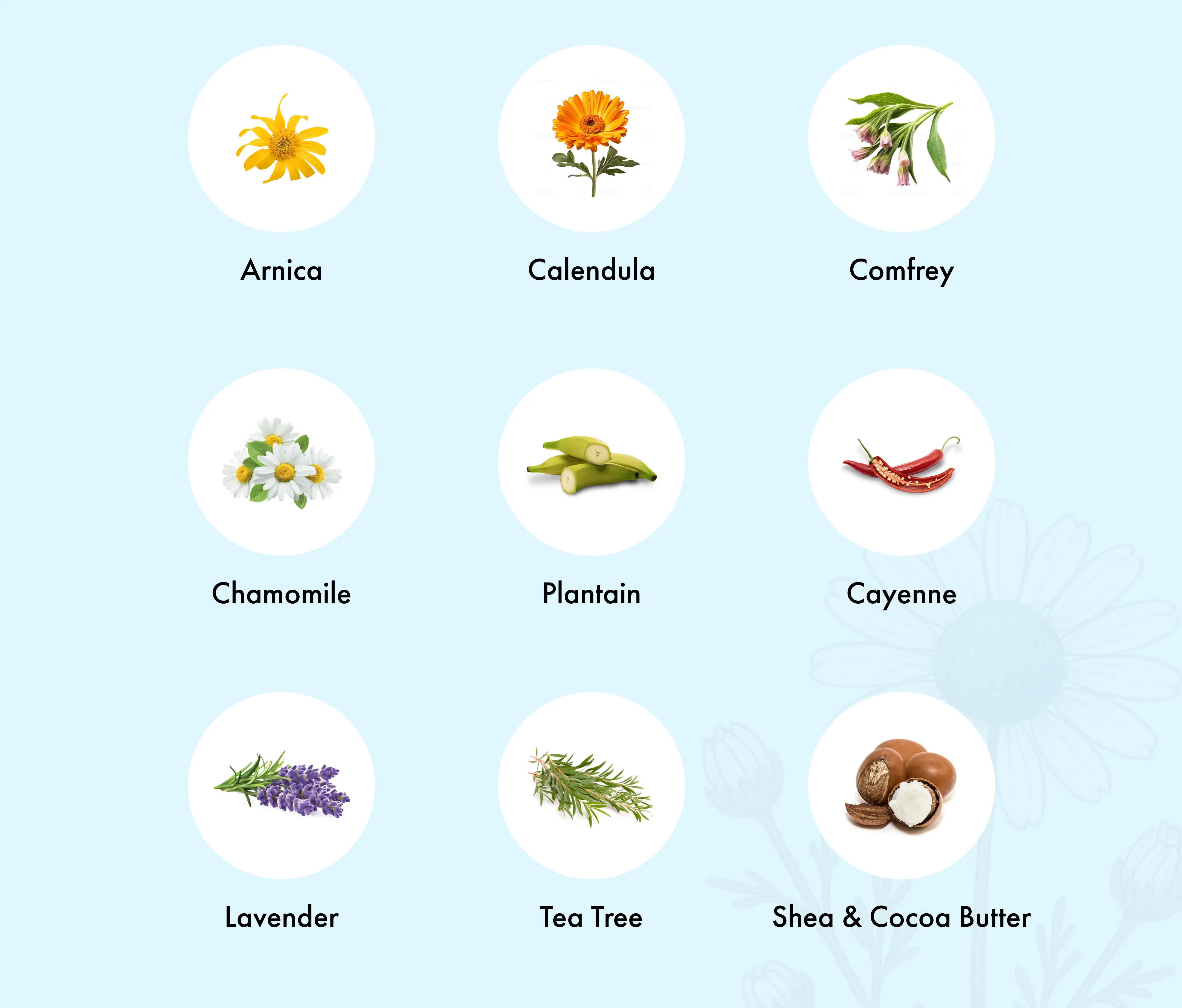 Pain Relief Salve: Organic Olive Oil, Beeswax, Arnica Montana Flower Extract, Capsicum Annuum (Cayenne) Fruit Extract, Zingiber Officinale (Ginger) Root Extract, Menthol, Peppermint Essential Oil, Wintergreen Essential Oil.