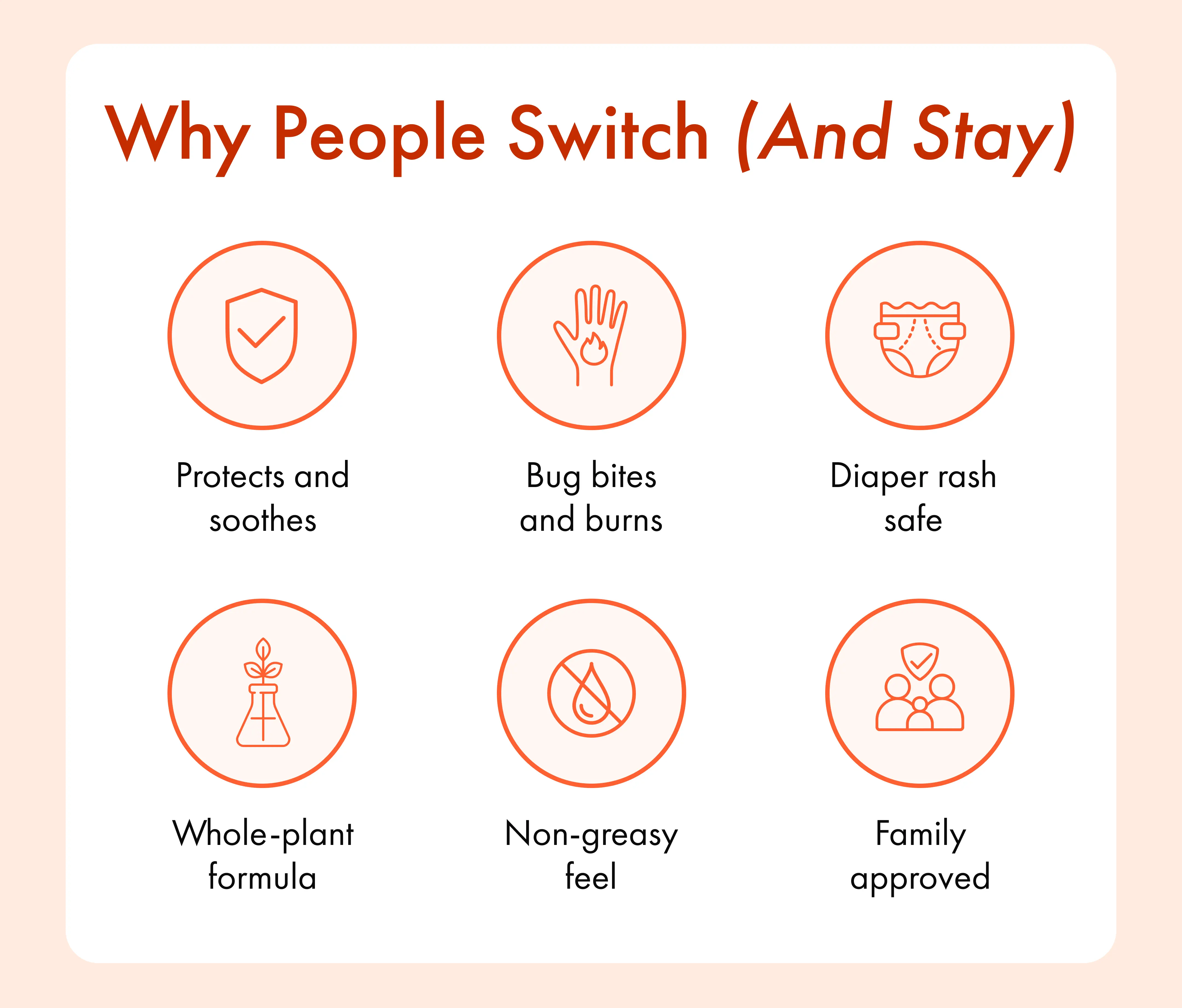 That soothing "ahh" on contact. Our breathable salve calms cuts, stings, and burns fast while forming a gentle barrier to support healing.